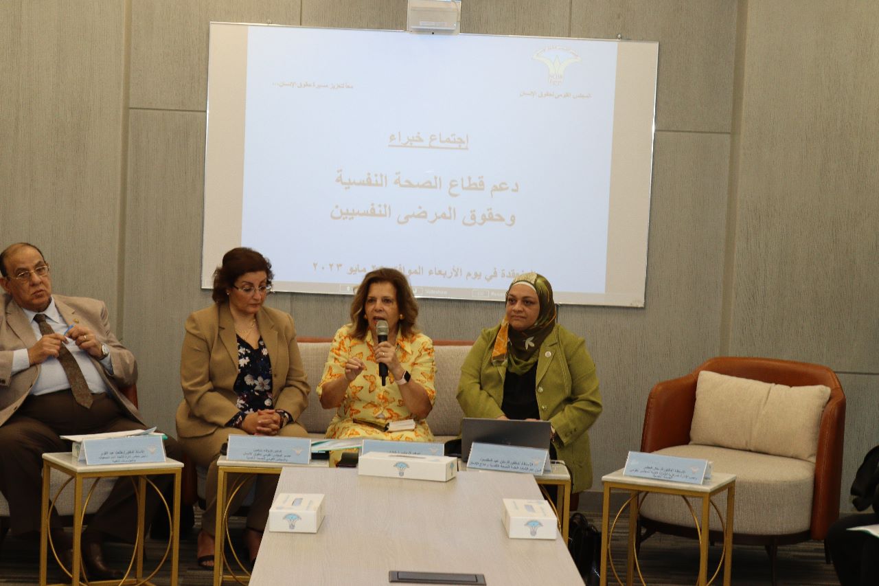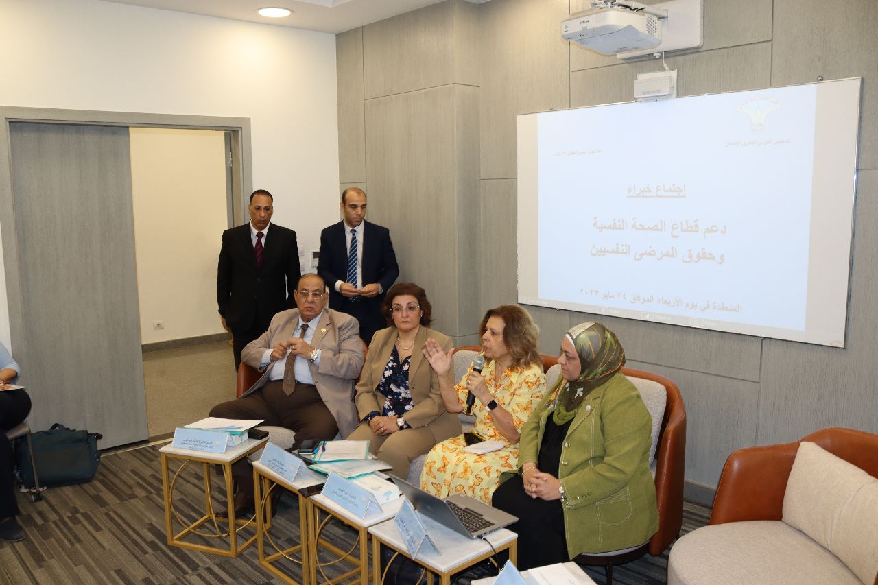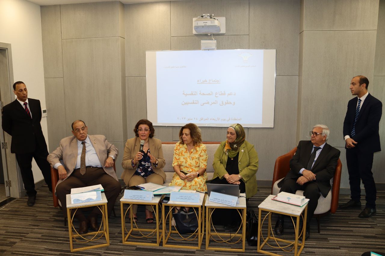 The National Council for Human Rights (NCHR) “Social Committee” held a meeting of experts to support the mental health sector and the rights of mentally ill patients, within the framework of the implementation of NCHR plan of action to protect and promote human rights, in the presence of Ms. Ambassador Moushira Khattab, President of NCHR, Dr. Wafa Benjamin, Secretary of the Social Rights Committee. Dr. Menen Abdel Maqsoud, Secretary General of the General Secretariat for Mental Health and Addiction Treatment at the Ministry of Health and Population, and Dr. Talaat Abdel Qawi, Chairman of the Board of Directors of the General Federation of Non-Governmental Associations and Institutions.