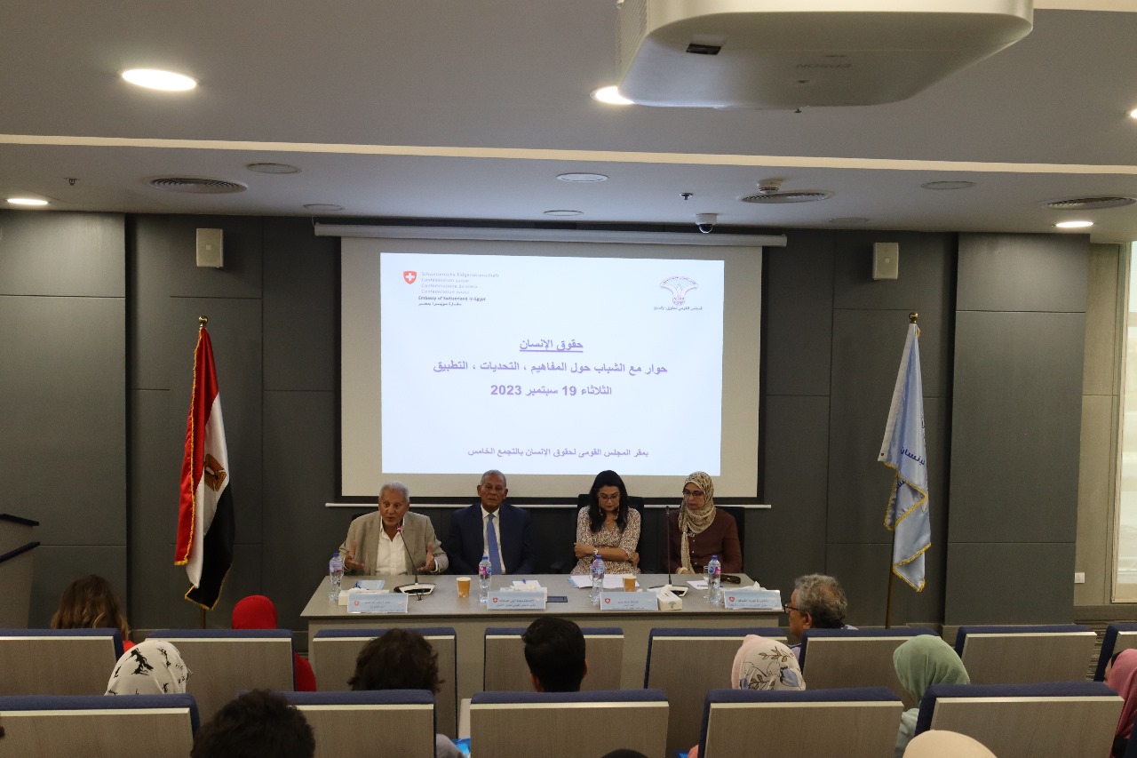 عقد المجلس القومي لحقوق الإنسان ورشة عمل بعنوان "حوار مع الشباب حول مفاهيم، وتحديات تطبيق حقوق الانسان" يوم الثلاثاء الموافق19 /9/2023 بمقره بالتجمع الخامس بالتعاون مع وزارة الشباب والرياضة، وذلك في إطار مشروع " دعم الجهود المبذولة لتعزيز المشاركة السياسية وآليات الديموقراطية في مصر " بالشراكة مع السفارة السويسرية بمصر.