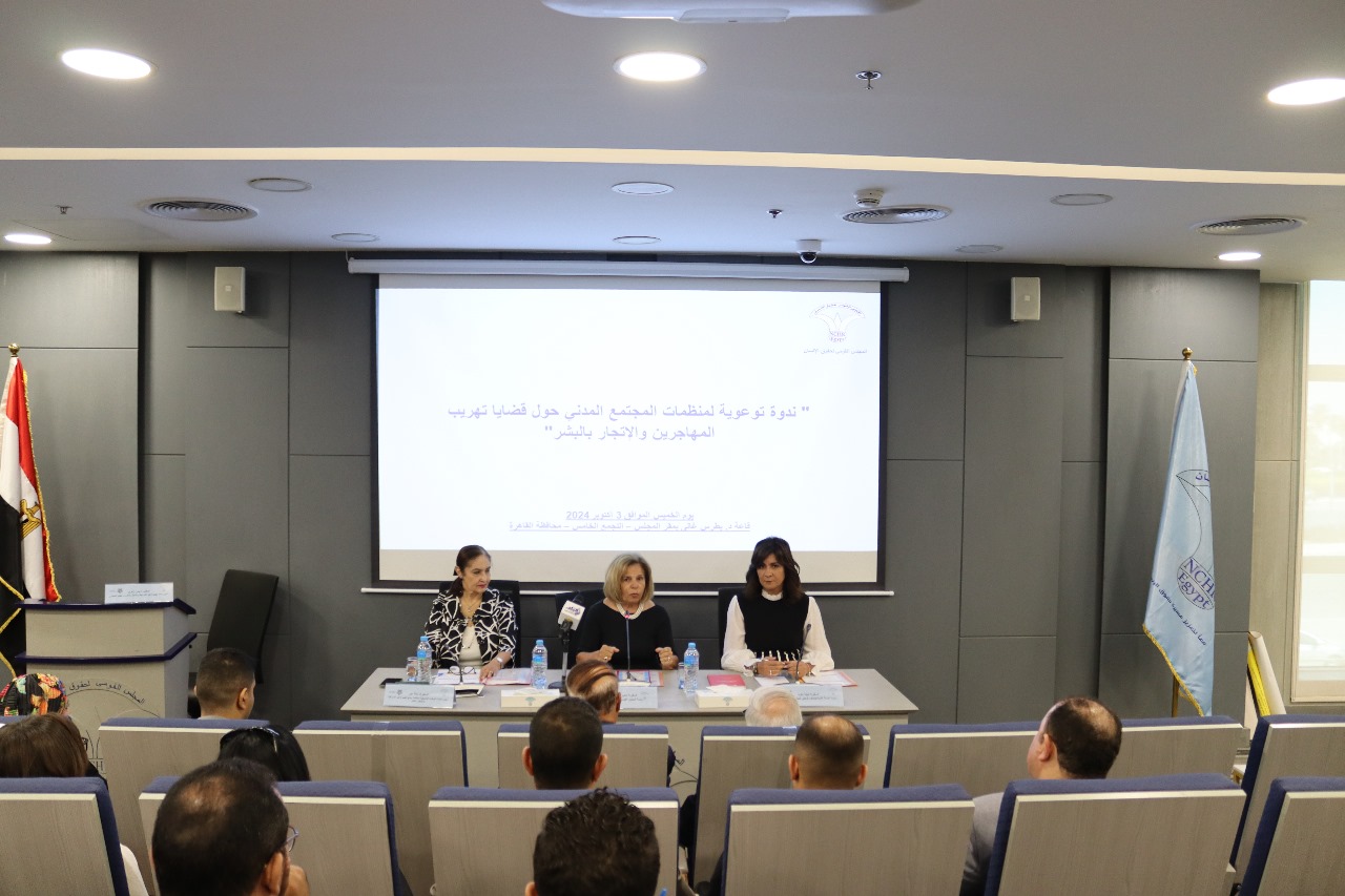 نظم المجلس القومى لحقوق الإنسان بالتعاون مع اللجنة الوطنية التنسيقية لمكافحة ومنع الهجرة غير الشرعية والاتجار بالبشر ندوة توعوية لمنظمات المجتمع المدنى حول قضايا تهريب المهاجرين والإتجار بالبشر، برئاسة السفيرة مشيرة خطاب رئيس المجلس، السفيرة نبيلة مكرم رئيس الأمانة الفنية للتحالف الوطنى للعمل الأهلى، والسفيرة نائلة جبر رئيس اللجنة الوطنية التنسيقية لمكافحة ومنع الهجرة غير الشرعية والاتجار بالبشر ، بمشاركة السفير محمود كارم نائب رئيس المجلس ، السفير فهمي فايد أمين عام المجلس ، الدكتور أيمن زهري عضو المجلس، وأمين اللجنة مكافحة الهجرة غير الشرعية، والأستاذ محمد ممدوح عضو المجلس وذلك بمقر المجلس .